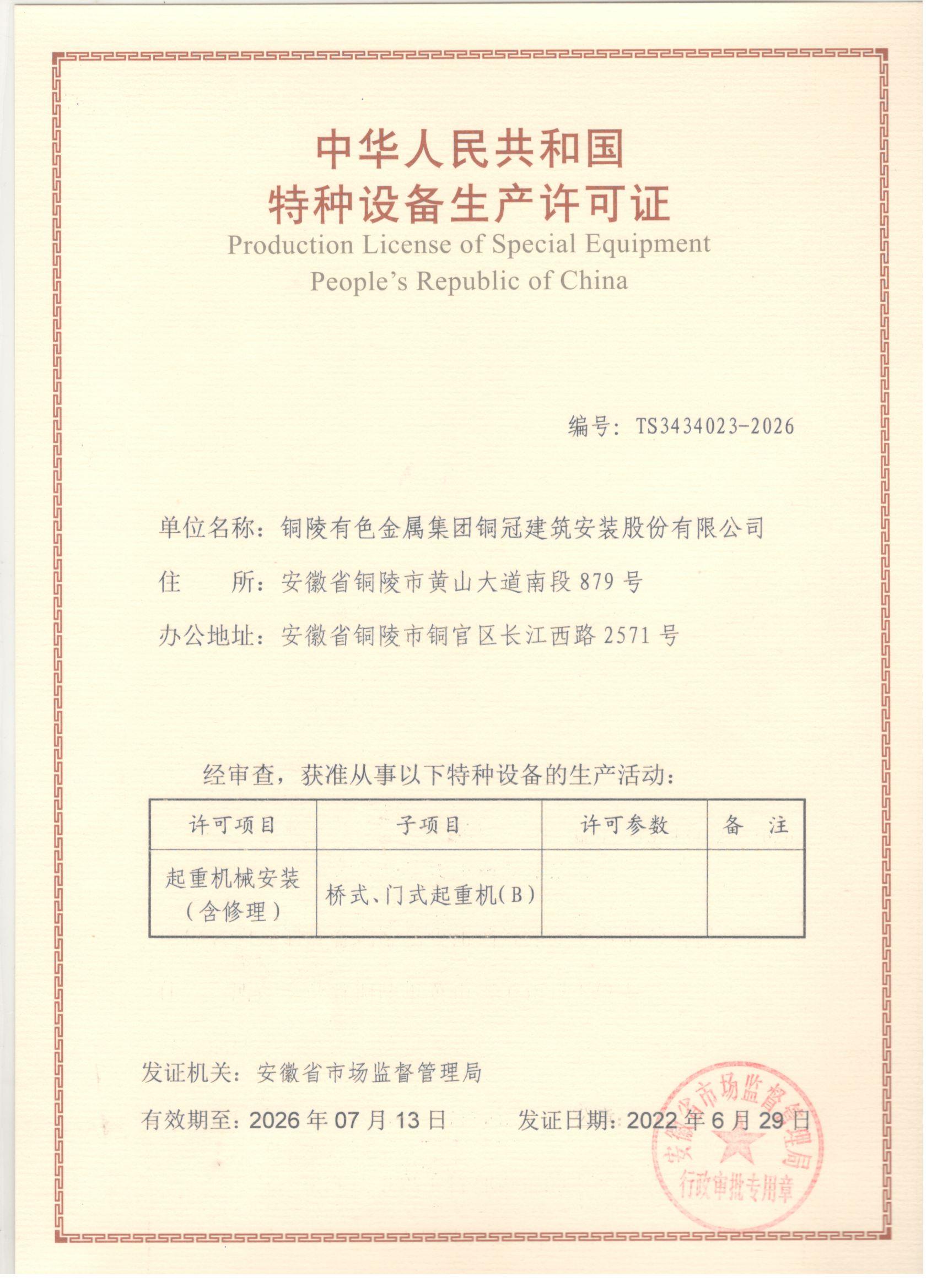 • 特種設(shè)備安裝改造修理許可證-起重機械