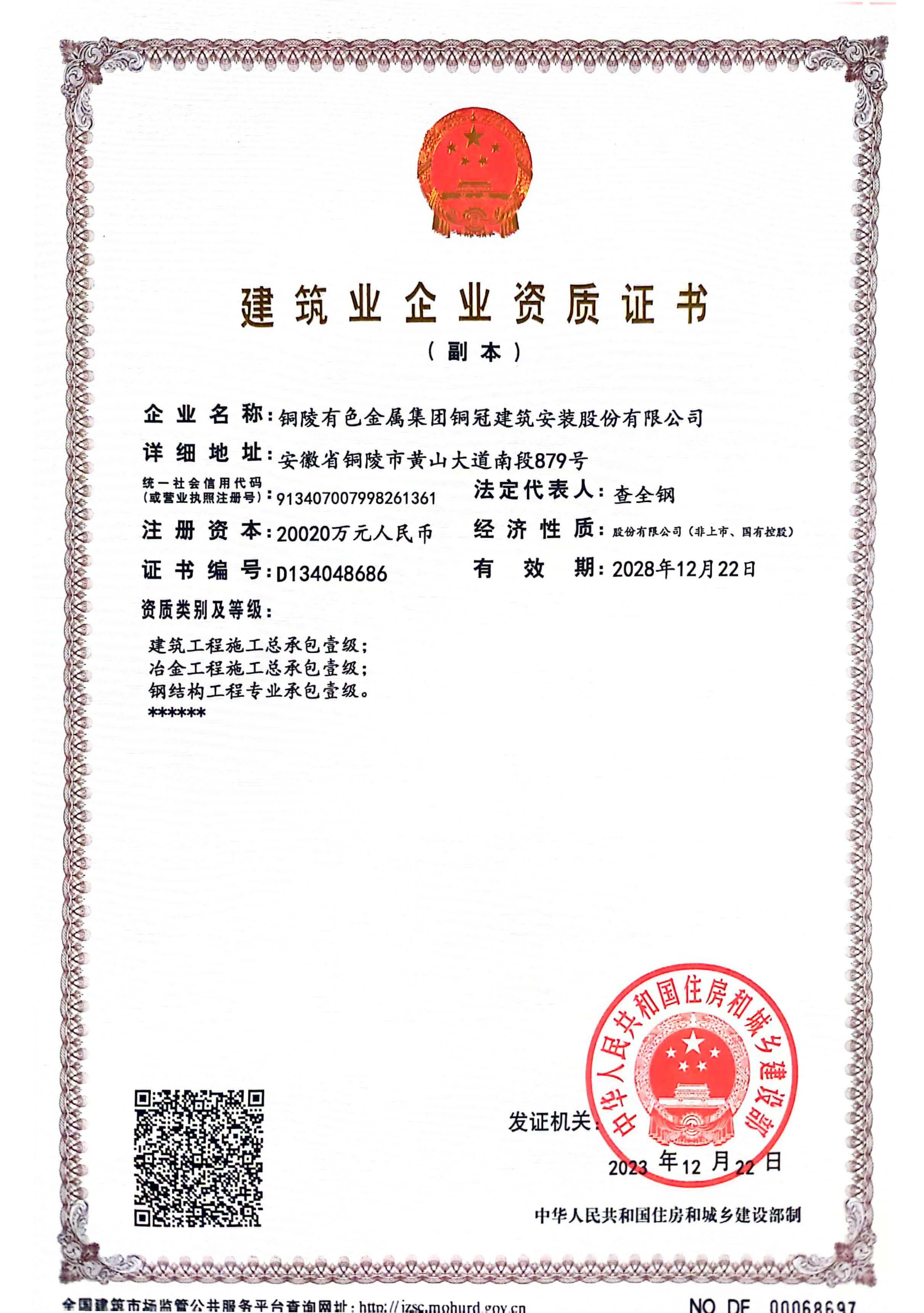 • 有色金屬工業(yè)建設(shè)工程質(zhì)量檢測機構(gòu)資質(zhì)證書